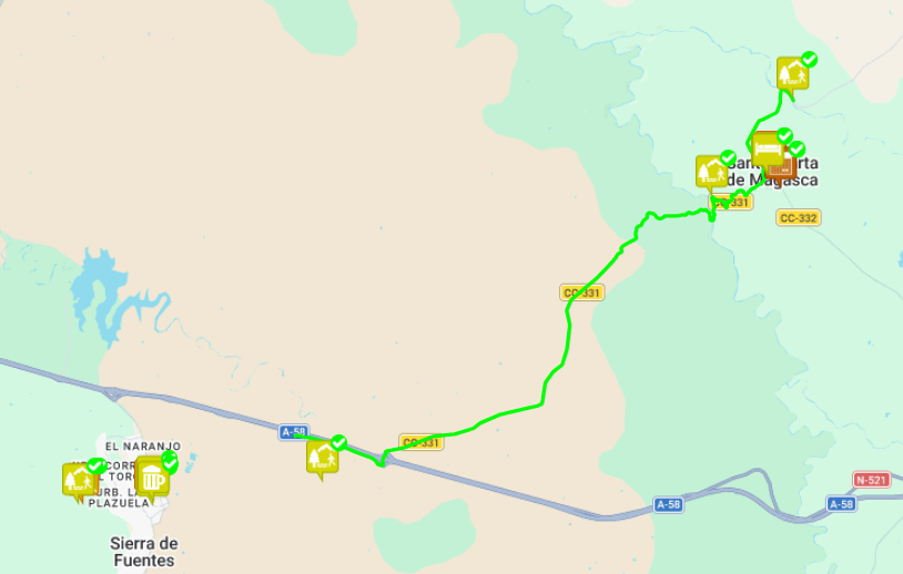 Esta ruta de 20,1 km, atraviesa tres destacados Puntos de Interés Ornitológico (PIOs) en el entorno de Santa Marta de Magasca y Sierra de Fuentes, dentro de zonas protegidas como las ZEPAs Llanos de Cáceres y Riberos del Almonte. Comienza en el PIO 01 CP 01 Cordel del Casar, donde pueden observarse aves esteparias y rapaces como avutardas, sisones y el águila imperial ibérica. Continúa por el PIO 16 CC 01 Riberos del Tamuja, caracterizado por su bosque mediterráneo y el río Tamuja, ideal para ver cigüeñas negras, martines pescadores y otras especies acuáticas. Finaliza en el PIO 17 CC 02 Riberos del Magasca, con hábitats de ribera que albergan culebreras europeas, milanos negros o garzas reales. La ruta, que combina accesibilidad con riqueza natural, incluye miradores, casetas de observación. Aprovecha tu estancia para ver el resto de recursos que se encuentran en estos dos municipios de la comarca Sierra de Montánchez y Tamuja.
