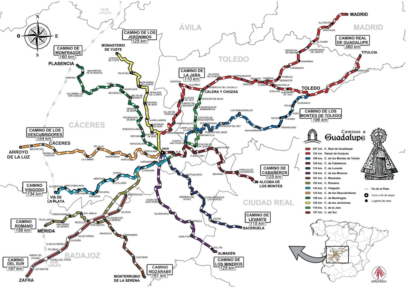 El Camino de los Descubridores tiene 133 Km., el recorrido del mismo es Cáceres, Sierra de Fuentes, La Cumbre, Madroñera, Garciaz, Berzocana, Guadalupe. El track que se acompaña es para hacer la ruta a pie, dividida en 6 etapas. Te aconsejamos que contactes con asociaciones ecuestres de la comarca si piensas hacerlo a caballo.