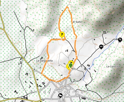 Se inicia al final de la calle Altozano, donde encontramos el panel informativo de la ruta. Recorremos los primeros metros compartiendo itinerario con el sendero PR-CC 27 “Ruta de los Molinos” hasta un poste con flechas direccionales nos indica nuestro desvío en dirección norte. Avanzamos por camino hasta desviarnos en una bifurcación a la derecha para adentrarnos en un sendero. Recorremos en este tramo la falda de la sierra hasta llegar a una intersección con otro sendero girando a la izquierda cambiando el rumbo hacia el sur. Avanzamos siguiendo las indicaciones de la señalización llegando al punto de interés que da nombre a la ruta. Continuamos recorriendo el itinerario por el paraje de “La Gargantilla” por callejas entre muros de piedra en ligero descenso; llegaremos a la carretera de entrada al casco urbano de Arroyomolinos, desde aquí y hasta el final de la ruta compartimos itinerario con el sendero PR-CC 27.