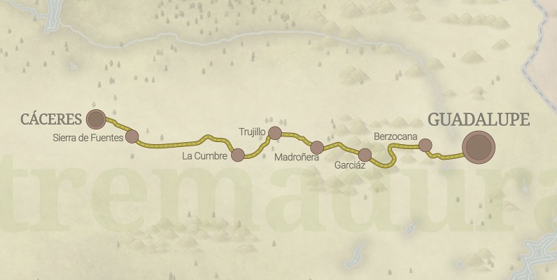 El Camino de los Descubridores tiene 133 Km., el recorrido del mismo es Cáceres, Sierra de Fuentes, La Cumbre, Madroñera, Garciaz, Berzocana, Guadalupe. El track que se acompaña es para hacer la ruta a pie, dividida en 6 etapas. Te aconsejamos que contactes con asociaciones ecuestres de la comarca si piensas hacerlo a caballo.