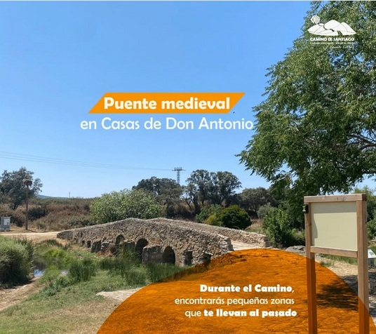 En la etapa Alcuéscar – Valdesalor, salimos de Alcuéscar por el Camino Viejo que conduce a Casas de Don Antonio, población a la que llegaremos cruzando el bello puente romano sobre el río Ayuela. Aunque el camino no entra en el centro del pueblo, merece la pena visitar sus dos rollos o picotas situadas en la plaza de España.