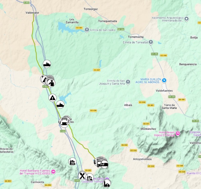 Tras algunos miliarios más, y cruzar un campo de vuelo y el recuperado puente romano sobre el río Salor, el camino llega a Valdesalor, pueblo de colonización agraria que dispone de servicios para el caminante.
