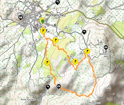 Partimos desde el complejo “Fuentes del Salor”, por la calle ascendente, compartiendo itinerario con los senderos PR-CC 27 “Ruta de los Molinos”, PR-CC 28 “Ruta de la Vaqueriza” y SL-CC 6 “Ruta del Castañar”. Continuaremos recorriendo gran parte de los hábitats presentes en la sierra, por sendas entre campos de vid, olivos, castaños y alcornoques. Pasaremos por el nacimiento del Arroyo de los Molinos, divisando infinidad de bancales de olivares y continuaremos por camino entre fuentes y pozos, pasando por la falda del Pico Montánchez, dejando a nuestra derecha el camino que sube a las antenas. Avanzaremos por camino y después por una senda entre castaños y chozos de piedra que nos devuelve al punto de partida.