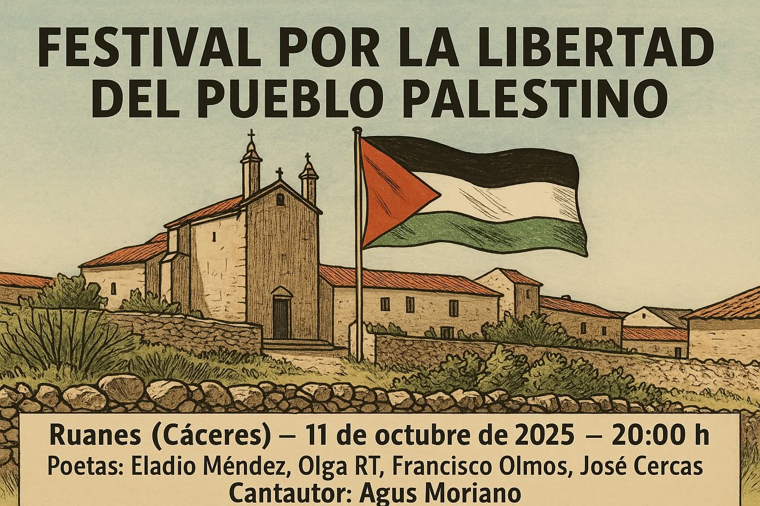 El próximo sábado 11 de octubre de 2025, a las 20:00 h, la localidad cacereña de Ruanes celebrará el Festival por la libertad del pueblo palestino. El encuentro reunirá a los poetas Eladio Méndez, Olga RT, Francisco Olmos y José Cercas, y contará con la actuación del cantautor Agus Moriano.