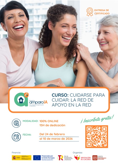 Desde la Diputación de Cáceres, en el marco del Programa IA AMPARO, te invitan a participar en estas acciones Formativas Online, con el objetivo de acercar herramientas digitales innovadoras a profesionales del sector de la atención sociosanitaria, así como acompañar y generar espacios de cuidado para las personas que cuidan, es decir personas como tú.